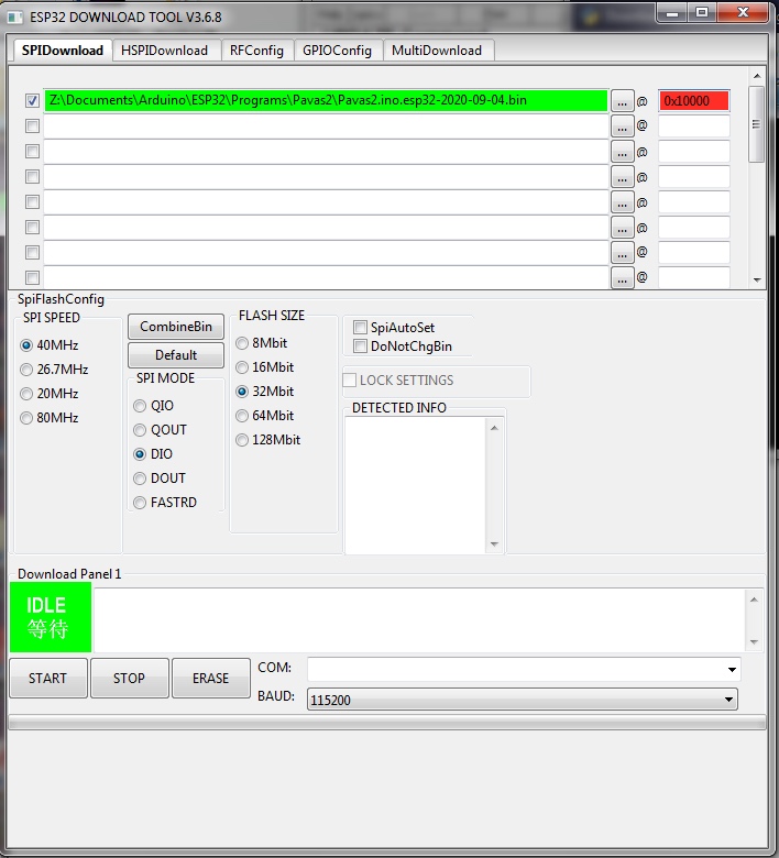 The first task is to browse to the Binary file. This is done by selecting the first button labeled (…). This will open a file explorer and allows a file to be selected. The check box to the left should be selected. This selection means that file will be used in the flash process. The last item at the top of the screen is to set the address in memory where the Binary file will be loaded to. This address must be 0x10000 as shown in the picture. The 0x indicates it is a hexadecimal address. Using a different or incorrect address will not allow the new program to run and could destroy other existing programs making the PAVAS unit totally unresponsive. The options are the SPI speed which is set to 40 MHz, the SPI mode which is DIO and Flash Size which is set to 32 Mbit.