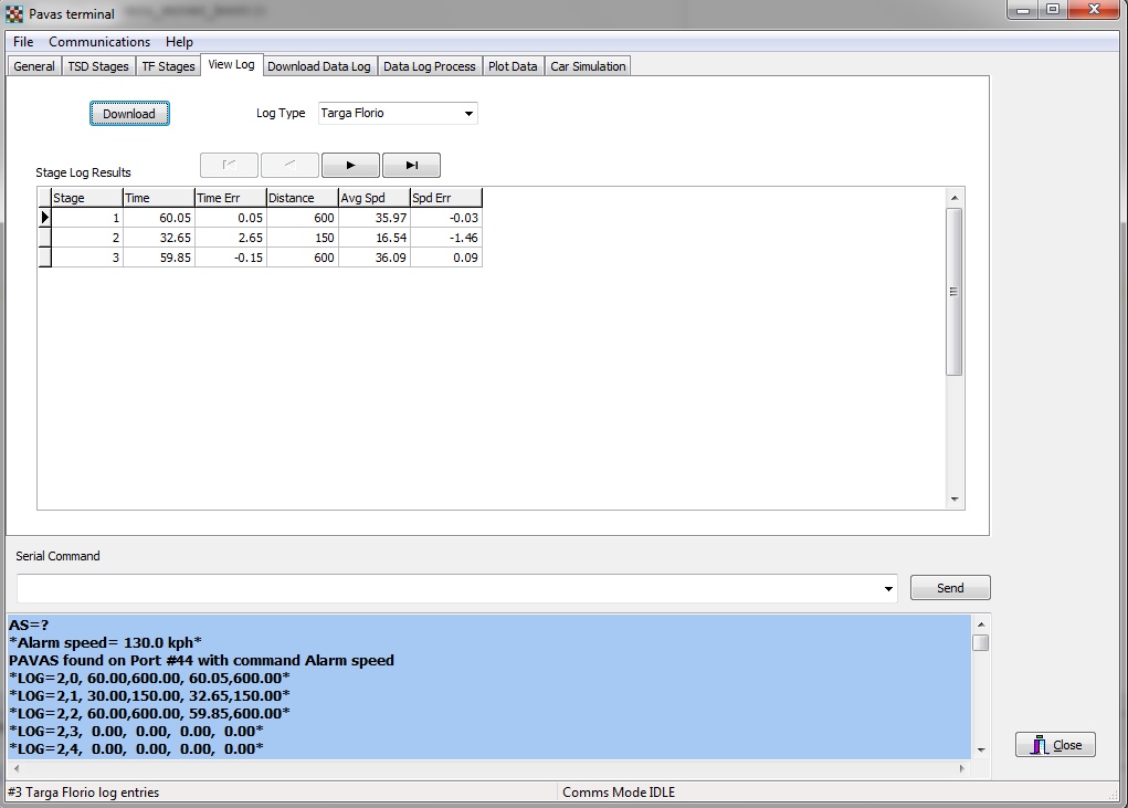 PAVAS saves three groups of logs for TSD, Reliability and Targa Florio stages. The TSD log saves results for 64 stages. The Reliability Log save results for 64 laps and the Targa Florio log saves results for 128 stages. The Log View Tab shows the results. The screen view is shown below.
