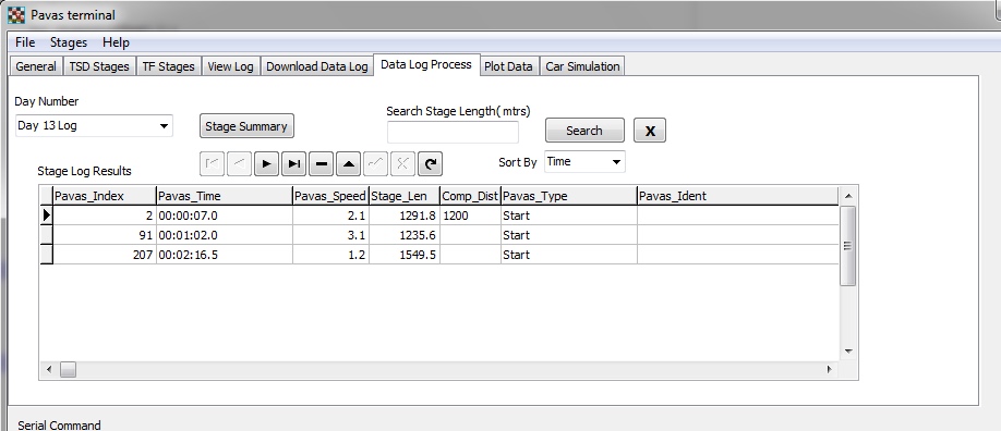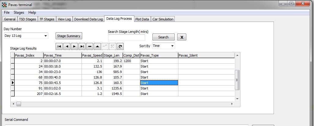 The software then searches through all stages for the day's data where the Competition distance has been set. It then looks for any zero speed conditions that are less then the Competition Distance. Once found, the speed values are changed to 0.1 KPH. This value has been chosen because it is non zero and most unlikely to occur in practice. Based on common wheel sizes and probe configurations, the minimum speed that can be measured by a PAVAS system is 0.25 to 0.5 kph. The software then saves the user entered data of the Competition Distance and the Stage name. It then processes all the modified data for the day to find the stages. Lastly it re-enters the User data and displays the list of stages. The spurious stages caused by Wheel Lock are now removed.