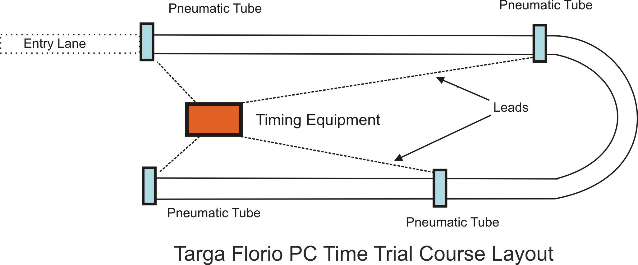 Targa Florio stages have very important Mode three which is designed for slow speed stages. The Road Book shows the distance and the time to be taken for each stage. The difficulty is that two or more stages are run consecutively with each stage starting after the previous one. This makes the navigator's task difficulty because he has to indicate the start of each stage and know what the time is for the stage. He then has to provide guidance to the driver to reach the end of each stage at a specific time. Given that the stages are quite short, the tasks are quite difficult. PAVAS simplifies driving these stages by using a concept of Linked Stages. The officials use a dedicated timer with pneumatics tubes to send the time the vehicle reaches the end of a stage and starting a timer for next sequential stage. A typical course layout is shown below.